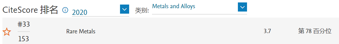 《稀有金屬(英文(wen)版)》(Rare Metals)CiteScore 2020:3.7,較2019年度(2.9)提(ti)升27.6%,位于Metals and Alloys學(xue)科Q1區(33/153),較2019年度(38/152)提(ti)升5名。