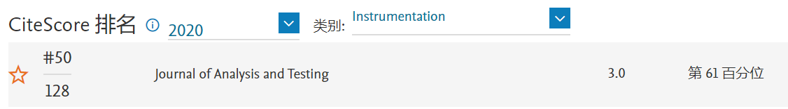 《分(fen)析檢測(英文(wen))》(Journal of Analysis and Testing) CiteScore 2020:3.0,較2019年度(1.8)提升66.7%,位于Instrumentation學科Q2區(50/128),較2019年度(84/129)提升34名(ming)。