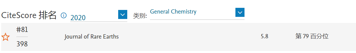 《稀土學(xue)報(英文版)》(Journal of Rare Earths)CiteScore 2020:5.8,較2019年度(du)(5.0)提升(sheng)16%,位(wei)于General Chemistry學(xue)科Q1區(81/398),較2019年度(du)(90/398)提升(sheng)9名。