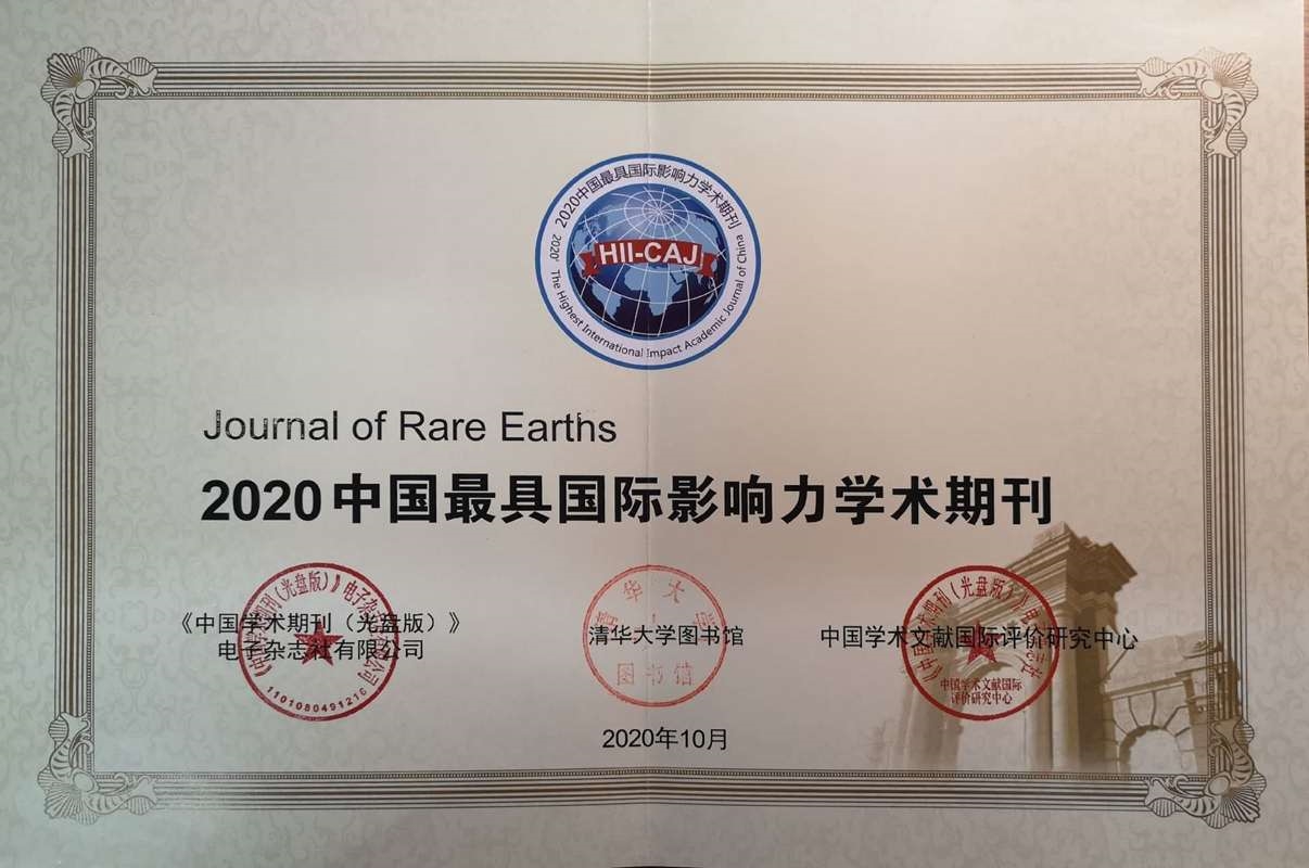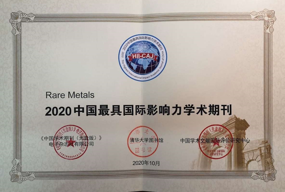 12月17日(ri),有(you)研集團主(zhu)辦的《稀(xi)有(you)金(jin)屬(英文版)》(Rare Metals)、《稀(xi)土學報(英文版)》(Journal of Rare Earths)雙(shuang)雙(shuang)入(ru)選2020年“中國(guo)最(zui)具(ju)國(guo)際影響力(li)學術期刊”榜單(dan),連續9年榮(rong)獲(huo)該稱號。