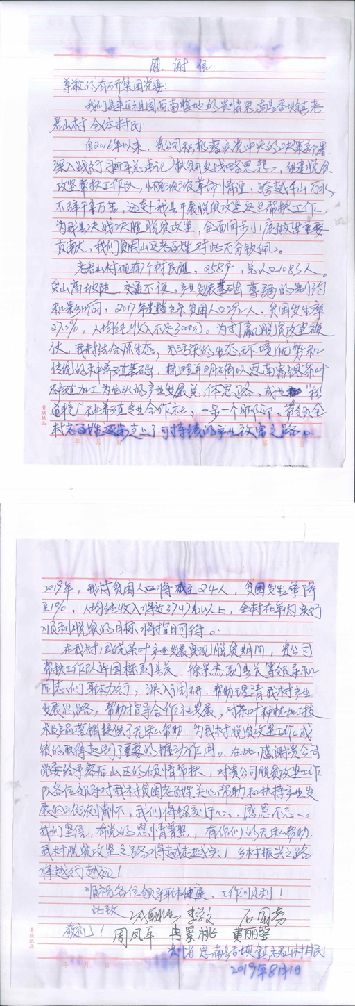近日(ri),有研集(ji)(ji)團黨(dang)委收(shou)到(dao)了一封(feng)特別的感謝信(xin),信(xin)件來自(zi)集(ji)(ji)團定點(dian)幫(bang)(bang)扶的貴州省(sheng)思南縣香壩鎮(zhen)老君山村,村民們自(zi)發寫信(xin)感謝有研集(ji)(ji)團對他(ta)們村脫貧(pin)攻堅工(gong)作(zuo)的無私(si)幫(bang)(bang)助(zhu)和傾情支持。來信(xin)言辭(ci)淳樸,字里行(xing)間對幫(bang)(bang)扶干(gan)部的感激之情溢(yi)于言表(biao),對有研集(ji)(ji)團脫貧(pin)攻堅工(gong)作(zuo)更是給與由衷贊(zan)譽。