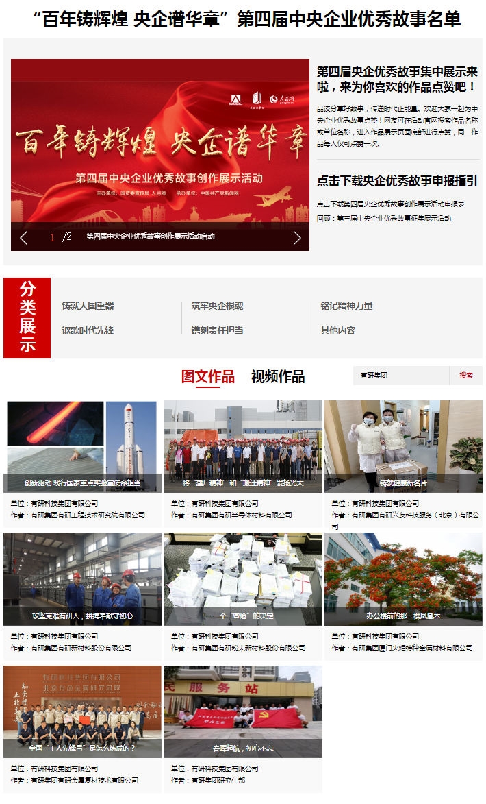 7月30日,由國(guo)資(zi)委宣傳局、人民(min)網聯合主(zhu)辦(ban)(ban),中國(guo)共產黨新聞網承辦(ban)(ban)的“百(bai)年鑄輝煌 央(yang)企(qi)(qi)(qi)譜華章(zhang)”慶(qing)祝(zhu)建黨百(bai)年暨第四屆中央(yang)企(qi)(qi)(qi)業(ye)優(you)秀(xiu)故事(shi)發布活(huo)動(dong)在北京舉辦(ban)(ban)。活(huo)動(dong)共收到(dao)各中央(yang)企(qi)(qi)(qi)業(ye)推薦(jian)(jian)報(bao)送(song)的圖文及視頻作(zuo)品(pin)1800余件(jian),評選(xuan)出一等(deng)獎30件(jian),二等(deng)獎50件(jian),三等(deng)獎80件(jian),優(you)秀(xiu)獎120件(jian),有研(yan)集(ji)團推薦(jian)(jian)報(bao)送(song)的作(zuo)品(pin)“攻堅克(ke)難有研(yan)人,拼搏奉獻(xian)守初心”榮獲(huo)三等(deng)獎。