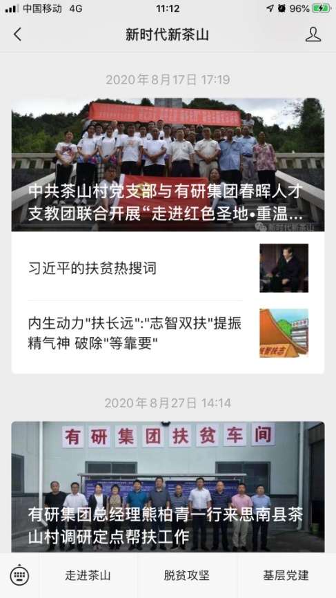 此外,我特意花(hua)精(jing)力(li)新(xin)建了“新(xin)時代新(xin)茶(cha)山(shan)(shan)”微(wei)信公眾號,保持(chi)2-3篇/周的(de)節(jie)奏,不(bu)僅僅對外做(zuo)好(hao)支部(bu)黨建、脫貧攻堅(jian)和產業發(fa)展的(de)事(shi)跡宣傳(chuan)報道,用心整理好(hao)發(fa)展足跡和生(sheng)動故事(shi),不(bu)斷(duan)擴大(da)茶(cha)山(shan)(shan)村的(de)知名度和影響(xiang)力(li);更重要的(de)是讓在外打工謀生(sheng)的(de)茶(cha)山(shan)(shan)籍人士(shi)及時了解茶(cha)山(shan)(shan)村的(de)發(fa)展變化,吸引和鼓勵有志青年回到大(da)有可為(wei)的(de)農村揮斥方遒、干事(shi)創業。