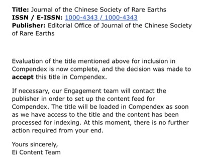 2021年(nian)4月3日,有科(ke)出版旗下《中(zhong)國稀土(tu)學(xue)報》(Journal of the Chinese Society of Rare Earths)收(shou)到美國工(gong)(gong)程(cheng)索引EI數據庫(ku)正式收(shou)錄通知,這(zhe)是(shi)(shi)該刊(kan)(kan)繼被美國化學(xue)文(wen)(wen)摘(CA)、荷蘭(lan)Scopus、日本科(ke)技文(wen)(wen)獻速報(JST)、美國EBSCO數據庫(ku)和俄羅斯(si)文(wen)(wen)摘(AJ)收(shou)錄后又一(yi)重要進(jin)展(zhan),標志著(zhu)《中(zhong)國稀土(tu)學(xue)報》國際(ji)影響力得到進(jin)一(yi)步提升(sheng)。《中(zhong)國稀土(tu)學(xue)報》創(chuang)刊(kan)(kan)于(yu)1983年(nian),是(shi)(shi)報道稀土(tu)理論(lun)研(yan)究和應(ying)用技術(shu)的稀土(tu)類綜合(he)性學(xue)術(shu)刊(kan)(kan)物(wu)。美國工(gong)(gong)程(cheng)索引(EI Compendex, 簡稱 EI)是(shi)(shi)全球(qiu)著(zhu)名工(gong)(gong)程(cheng)技術(shu)類綜合(he)性檢(jian)索系統。它與SCI、ISTP并列成為世界公認的三大權威數據庫(ku),最新目錄共(gong)收(shou)錄全球(qiu)4500余種期刊(kan)(kan),其中(zhong)共(gong)收(shou)錄中(zhong)國大陸期刊(kan)(kan)229種,中(zhong)文(wen)(wen)刊(kan)(kan)157種,英文(wen)(wen)刊(kan)(kan)71種。