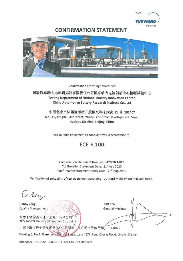 TÜV北德(de)為(wei)檢(jian)測(ce)(ce)試(shi)驗(yan)(yan)中(zhong)(zhong)心(xin)發放授權證(zheng)書,代表(biao)了TÜV北德(de)對檢(jian)測(ce)(ce)試(shi)驗(yan)(yan)中(zhong)(zhong)心(xin)測(ce)(ce)試(shi)能(neng)力(li)的認可,同(tong)時也充分證(zheng)明(ming)了檢(jian)測(ce)(ce)試(shi)驗(yan)(yan)中(zhong)(zhong)心(xin)有能(neng)力(li)按照 ECE-R100標準進行(xing)相關(guan)產品測(ce)(ce)試(shi)。檢(jian)測(ce)(ce)試(shi)驗(yan)(yan)中(zhong)(zhong)心(xin)表(biao)示,將以此為(wei)新起點(dian),不斷增強自(zi)身檢(jian)測(ce)(ce)技(ji)術能(neng)力(li),為(wei)客戶提供更好服務。