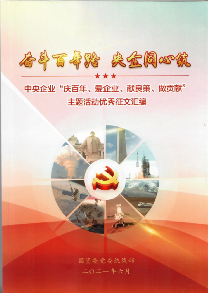 結(jie)(jie)合國(guo)資委黨(dang)(dang)委統(tong)(tong)戰(zhan)(zhan)部“奮(fen)(fen)斗(dou)百(bai)年(nian)路(lu)(lu)(lu) 央企同(tong)心(xin)筑(zhu)”主題(ti)征文(wen)(wen)活動(dong),在(zai)全集(ji)(ji)團統(tong)(tong)戰(zhan)(zhan)對(dui)象中(zhong)廣泛動(dong)員,組織(zhi)廣大統(tong)(tong)戰(zhan)(zhan)對(dui)象結(jie)(jie)合自身經(jing)歷,講(jiang)述在(zai)黨(dang)(dang)的領導下奮(fen)(fen)斗(dou)愛國(guo)、科研強企,推動(dong)集(ji)(ji)團創(chuang)新驅動(dong)高(gao)質量(liang)發展(zhan)(zhan)的故事(shi),集(ji)(ji)中(zhong)展(zhan)(zhan)現集(ji)(ji)團廣大統(tong)(tong)戰(zhan)(zhan)對(dui)象攜手同(tong)心(xin)、共創(chuang)偉(wei)業(ye)的良好精神風貌。向國(guo)資委黨(dang)(dang)委統(tong)(tong)戰(zhan)(zhan)部推薦的《從黨(dang)(dang)史中(zhong)汲取奮(fen)(fen)進力量(liang) 用(yong)心(xin)走好三步(bu)路(lu)(lu)(lu)》入選《奮(fen)(fen)斗(dou)百(bai)年(nian)路(lu)(lu)(lu) 央企同(tong)心(xin)筑(zhu)——中(zhong)央企業(ye)“慶百(bai)年(nian)、愛企業(ye)、獻良策、做貢獻”主題(ti)活動(dong)優秀(xiu)征文(wen)(wen)匯編(bian)》。
