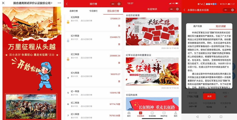 自3月15日(ri)起,國合(he)通測7個(ge)(ge)黨支(zhi)部分別命名為(wei)紅軍(jun)(jun)長征中的7個(ge)(ge)軍(jun)(jun)團,以每(mei)日(ri)線下(xia)行走(zou)步數兌換線上里程,力爭七(qi)一(yi)前人(ren)均走(zou)完(wan)25000里(行軍(jun)(jun)標準為(wei)每(mei)日(ri)人(ren)均至少7100步)。同時通過“重走(zou)長征路”程序,專(zhuan)題學習(xi)黨史知(zhi)識。每(mei)到達(da)紅軍(jun)(jun)長征標志性地點,可點擊(ji)彈(dan)框學習(xi)相(xiang)關知(zhi)識。